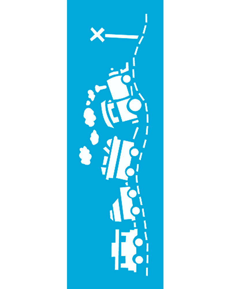 Este stencil simples Trem III é composto de material 100% em acetato, onde é bastante flexível facilitando sua aplicação em várias superfícies como tecido, papel, madeira, parede, cerâmica, metal ou etc.