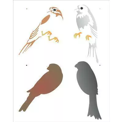 Este stencil simples Pássaros é composto de material 100% em acetato, onde é bastante flexível facilitando sua aplicação em várias superfícies como tecido, papel, madeira, parede, cerâmica, metal ou etc.