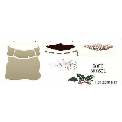 Este stencil simples Saco de Café é composto de material 100% em acetato, onde é bastante flexível facilitando sua aplicação em várias superfícies como tecido, papel, madeira, parede, cerâmica, metal ou etc.