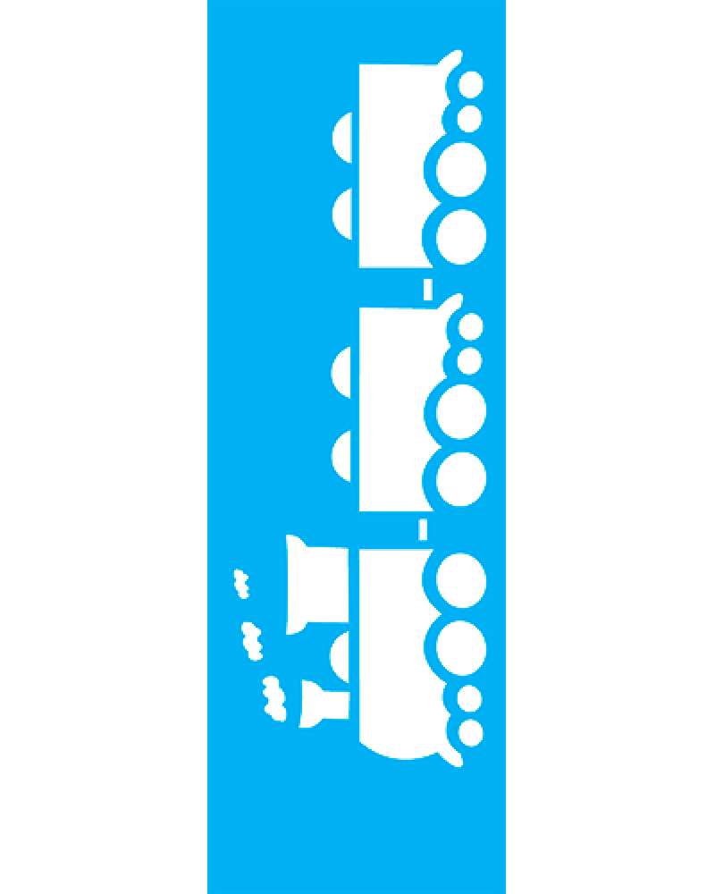 Este stencil simples Trem II é composto de material 100% em acetato, onde é bastante flexível facilitando sua aplicação em várias superfícies como tecido, papel, madeira, parede, cerâmica, metal ou etc.