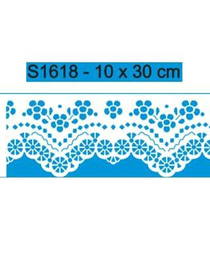 Este stencil Barrado com Flores é composto de material 100% em acetato branco, onde é bastante flexível facilitando sua aplicação em várias superfícies como tecido, papel, madeira, parede, cerâmica, metal ou etc.